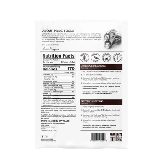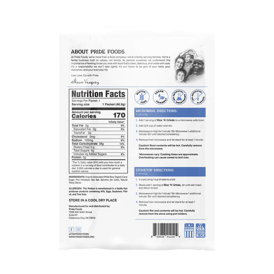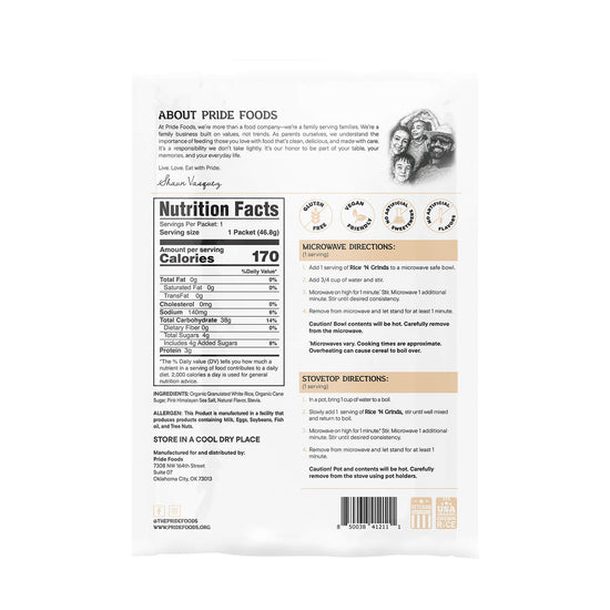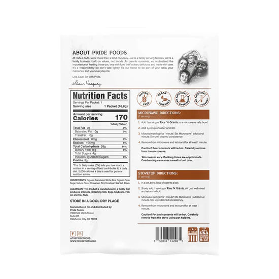 Breakfast shouldn’t be a compromise. Pride Foods Rice ’N Grinds is USDA Organic hot cereal made from 100% American-grown white rice—clean fuel you can feel good about serving yourself and your family.